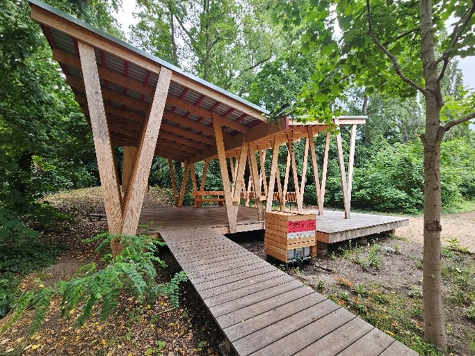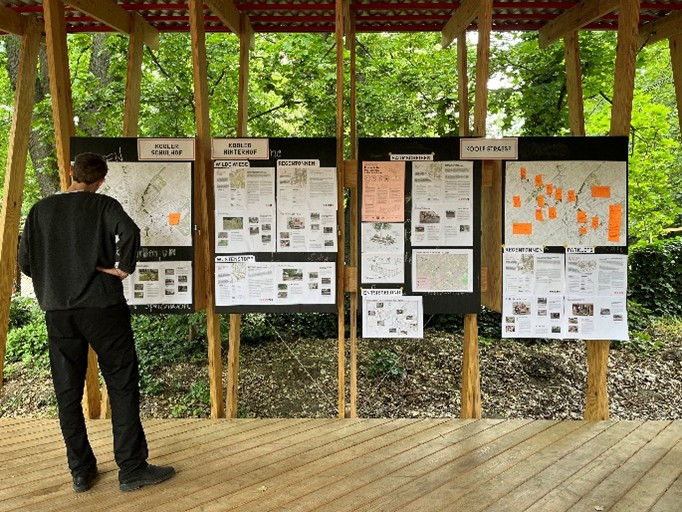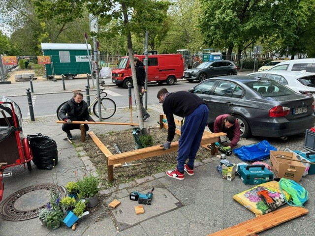 In dieser Zeit sind viele wunderbare Orte entstanden: bepflanzte Baumbeete, die Lebensraum für Insekten und ökologische Vielfalt bieten, bunte Parklets, die als Treffpunkte im Straßenraum dienen, sowie mehrere Regentonnen und sogar eine Regenbank, mit der Regenwasser gesammelt und zum Gießen genutzt werden kann. Besonders stolz sind wir auf das Grüne Klassenzimmer im Schulhof der Herbert-Hoover-Schule, das gemeinsam mit Schüler:innen und dem Kollegium geplant und schließlich von quando quando umgesetzt wurde. Heute ist es ein klimaresilienter Lernort, der zeigt, wie Bildung, Beteiligung und Klimaanpassung zusammengehen können.