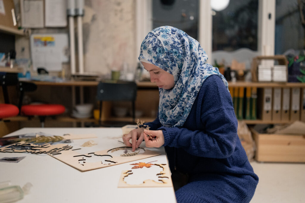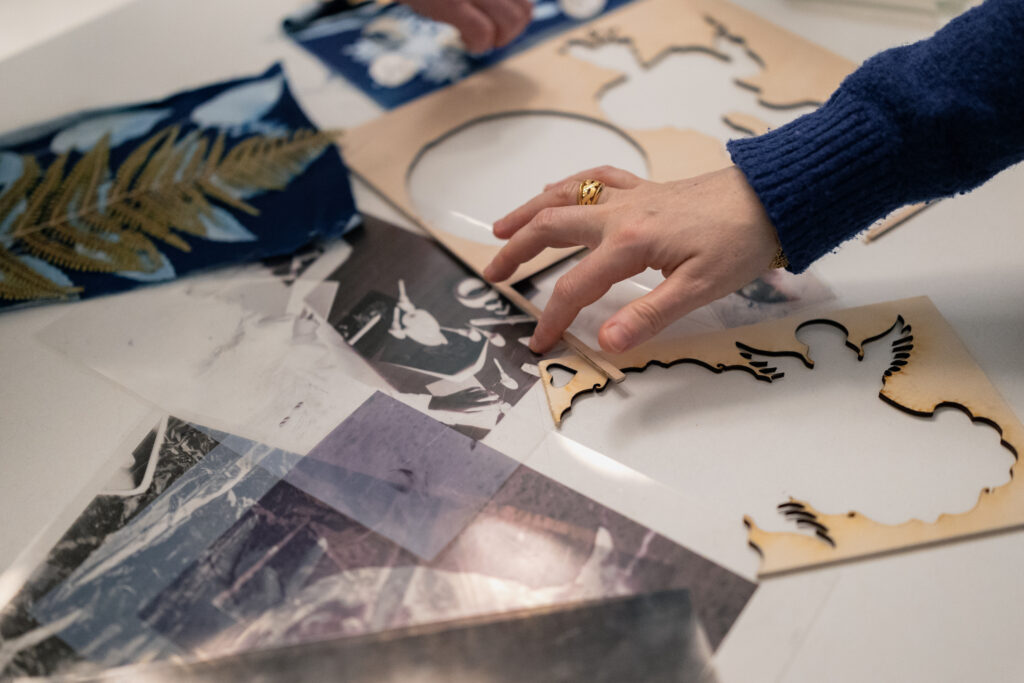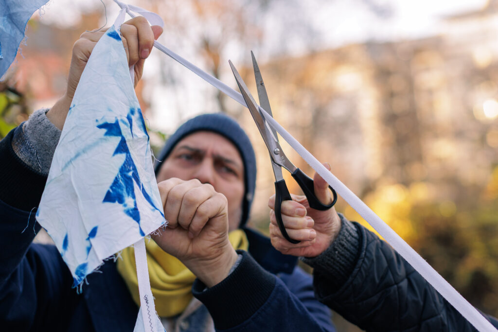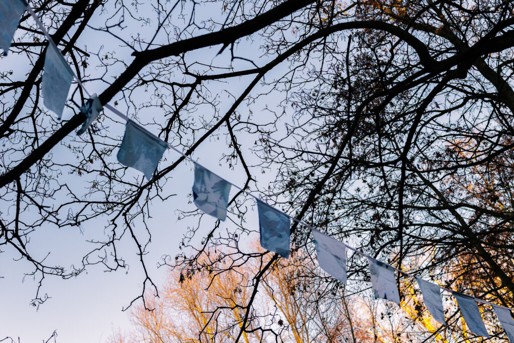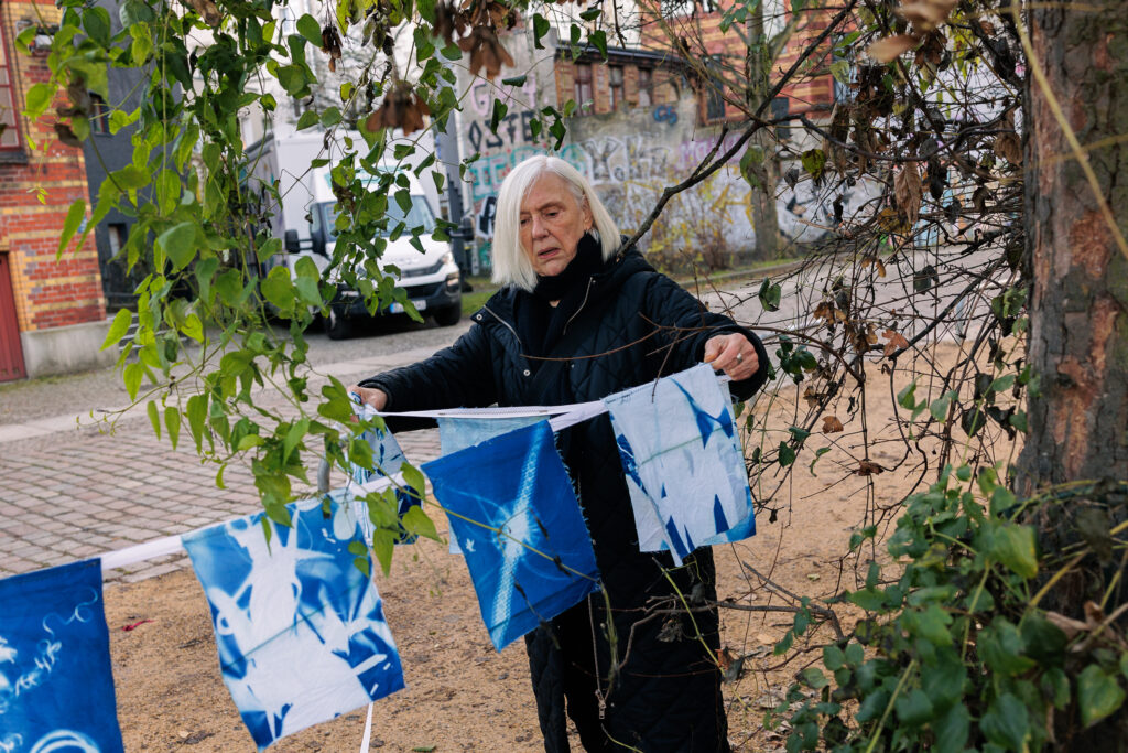 Der erste Workshop der Aktionswoche fand in der Kita Pankonauten statt. Dort lernten die Teilnehmenden das Druckverfahren Cyanotypie, auch Blaudruck genannt, kennen – eines der ältesten fotografische Druckverfahren. Der Kreativität waren dabei keine Grenzen gesetzt. Mit Naturmaterialien wie Federn und Blättern sowie unterschiedlichen Alltagsgegenständen wurden individuelle Muster auf den speziellen Stoff gedruckt. So entstanden zahlreiche einzigartige Fähnchen.