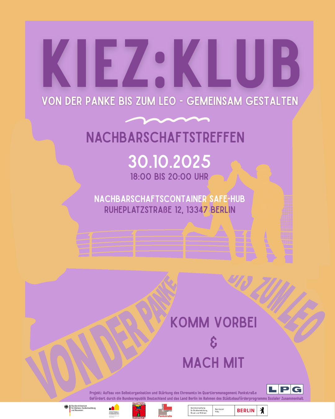 Haus der Jugend Reinickendorferstr. 55, BerlinIm August 2025 hat sich im Rahmen des QM-Projekts „Aufbau von Selbstorganisation und Stärkung des Ehrenamts im Quartier“ des Quartiersmanagements Pankstraße der Kiez:Klub gegründet – gemeinsam mit engagierten Nachbar*innen. Der…