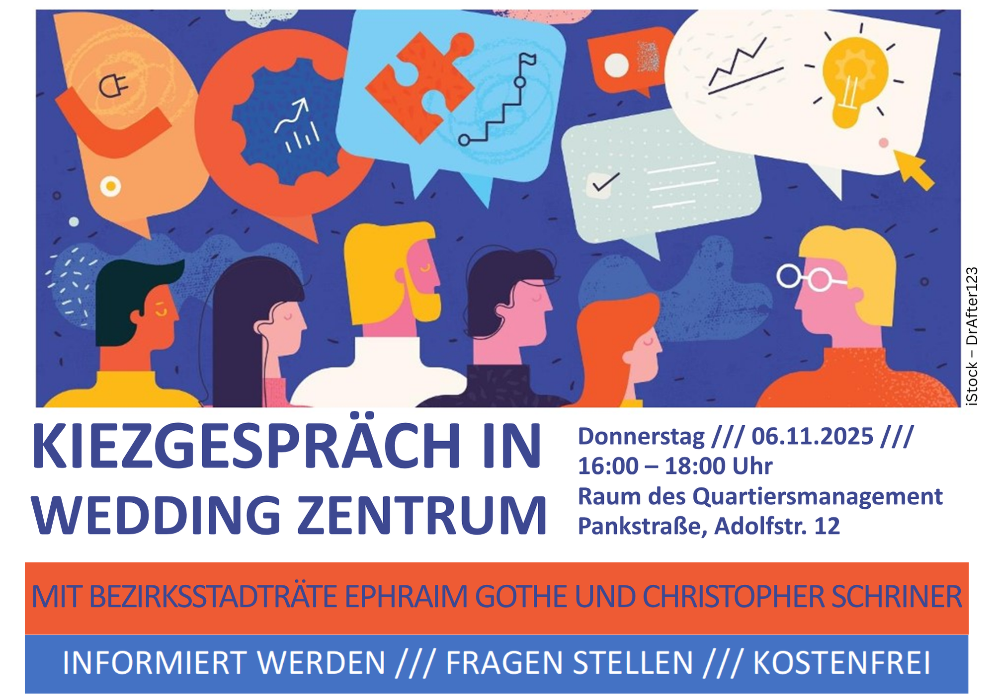 Adolfstr. 12Der Bezirksstadtrat für Ordnung, Umwelt, Natur, Straßen und Grünflächen, Christopher Schriner, und der Bezirksstadtrat für Stadtentwicklung und Facility Management, Ephraim Gothe, laden gemeinsam zum Kiezgespräch Wedding Zentrum ein. Die Veranstaltung…