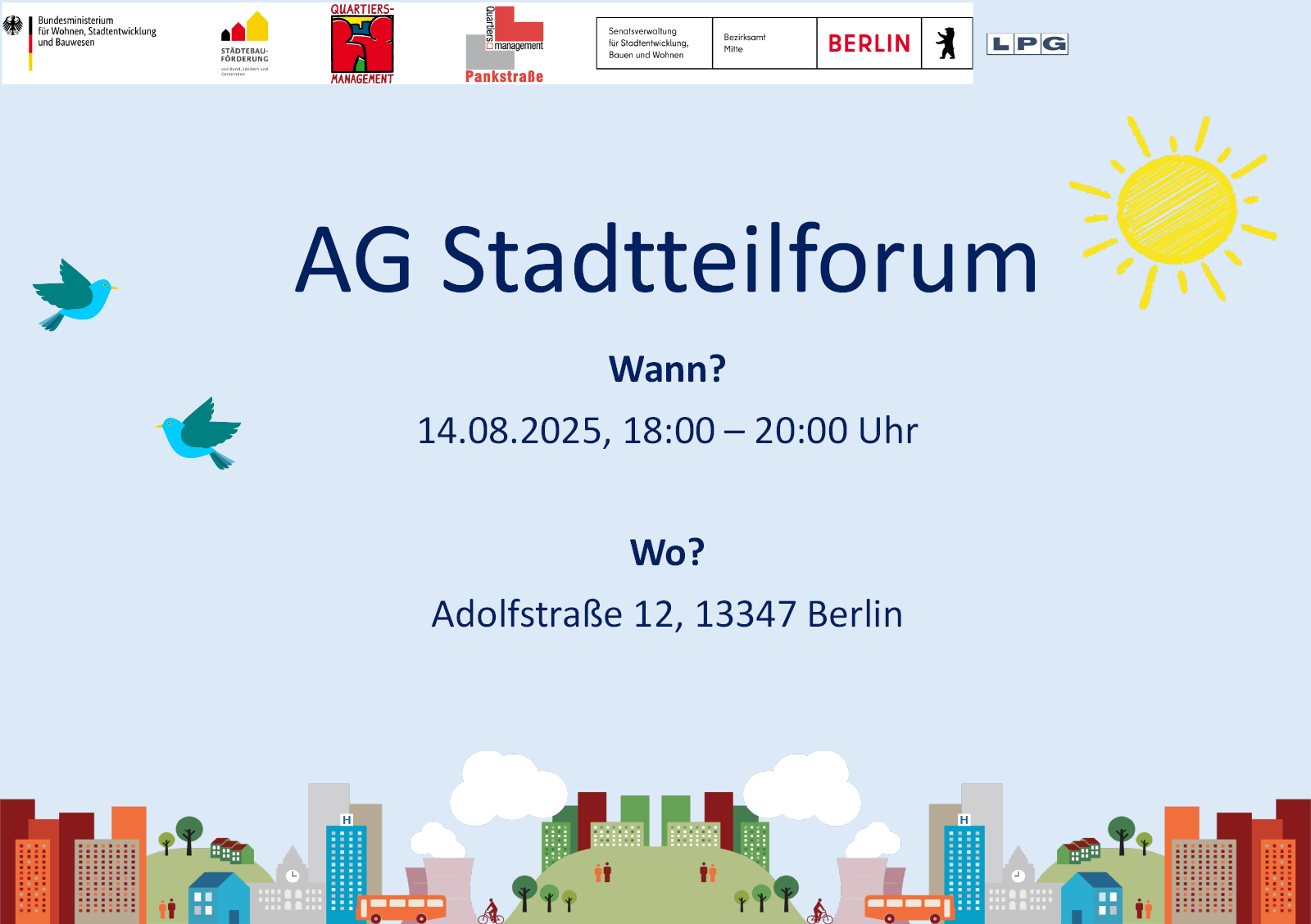 Adolfstr. 12Unter der Moderation des Projektträgers LPG planen Nachbar:innen und Engagierte die im Herbst stattfindende Beteiligungsveranstaltung „Stadtteilforum“. In der AG Stadtteilforum wird die Veranstaltung gemeinsam mit Bewohner:innen und Engagierten organisiert: Wo und wann findet das Stadtteilforum statt? Was bewegt den Kiez und welche Themen sollen diskutiert werden? Was wird benötigt? Das nächste Planungstreffen „AG Stadtteilforum“ findet…